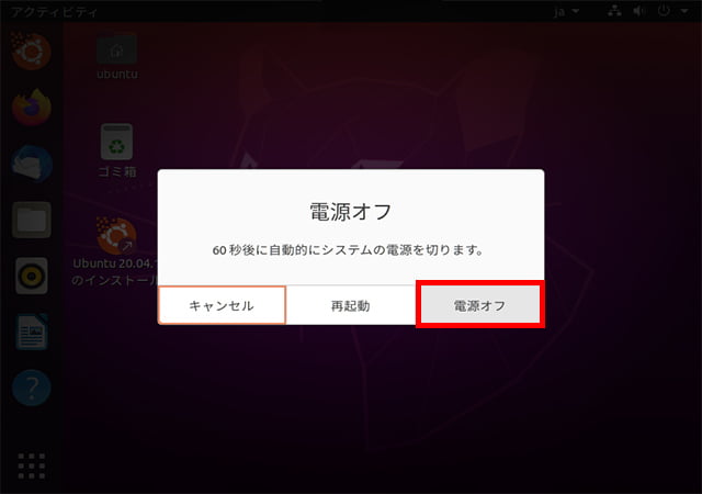 確認画面が表示されるので、「電源オフ」をクリックしてください(60秒経過すると、自動的に電源オフが開始されます)