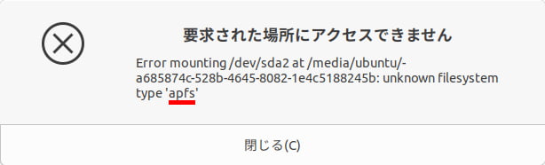 エラー情報を参考に調べてみると、アクセスしようとした内臓HDDが、Macの新しいファイルシステムである「APFS」フォーマットであることが原因のようでした。