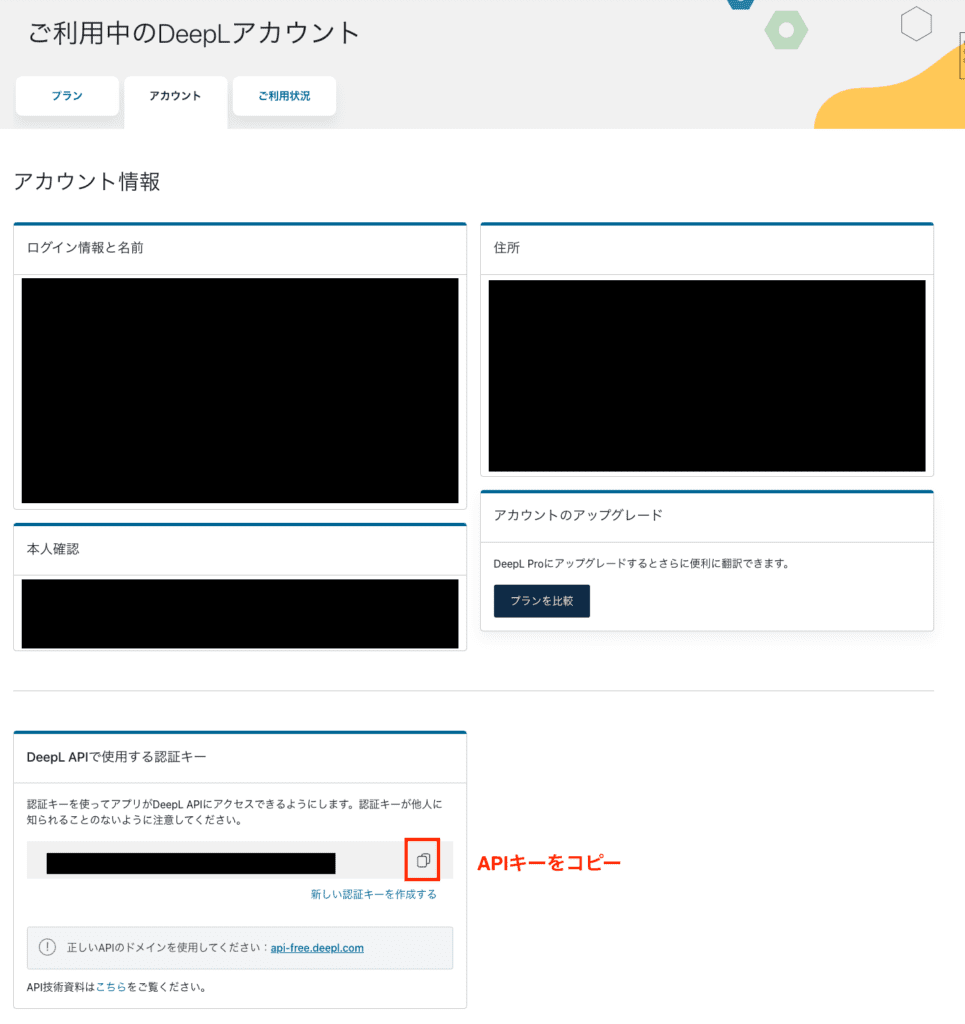 アカウントメニューの「アカウント」タブのDeepL APIで使用する認証キーメニューにAPIキーが表示されているのを確認します。