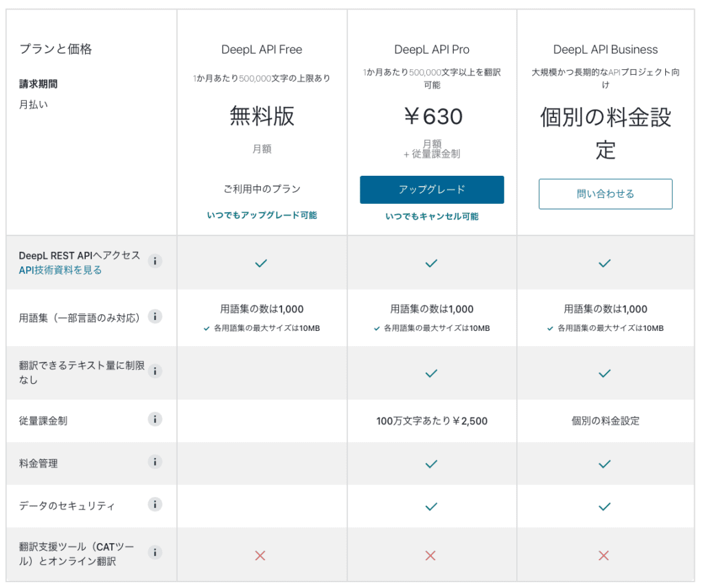フリープランでも、500,000文字まで翻訳でき、機能も変わらないので利用頻度が少なければフリープランで充分そうです。