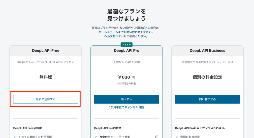 DeepL APIページ の下部にある無料版で登録しましょう。