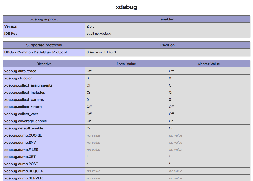 ~~色々書いてある~~ [xdebug] zend_extension="/Applications/MAMP/bin/php/使用しているPHPバージョン/lib/php/extensions/no-debug-non-zts-20131226/xdebug.so" <-コメントアウトを外す xdebug.profiler_output_dir="/tmp/xdebug/" xdebug.profiler_enable=On xdebug.remote_enable=On xdebug.remote_host="localhost" xdebug.remote_port=9000 xdebug.remote_handler="dbgp" xdebug.idekey="sublime.xdebug" xdebug.overload_var_dump = 0 xdebug.var_display_max_children = 128 xdebug.var_display_max_data = 1024 xdebug.var_display_max_depth = 10 xdebug.dump.GET= * xdebug.dump.POST= * xdebug.dump.SESSION= *